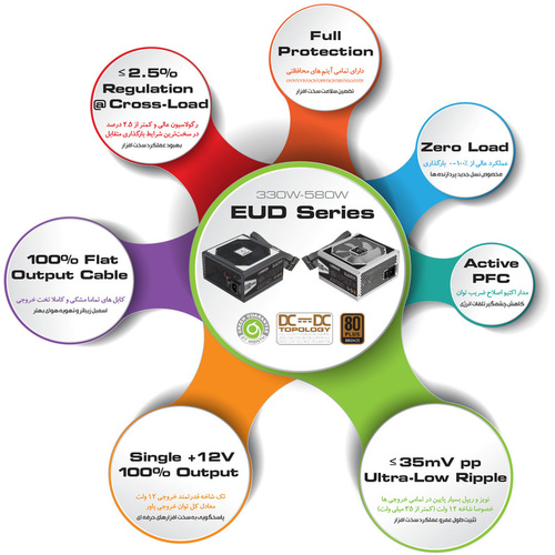 مشخصات تکمیلیعمرمفید در شرایط استاندارد: 100,000 ساعت دامنه دمای محیط کاری: 0 تا 40 درجه سانتی‌گراد تنظیم اتوماتیک دور فن: SNTC بی صدا پشتیبانی از فیلترینگ ورودی EMI طول کابل های اصلی خروجی: 45 سانتی‌متر نداشتن محدودیت در بارگزاری متقابل (Cross-Load) کابل‌های اصلی از نوع تخت پشتیبانی از توپولوژی DC-DC